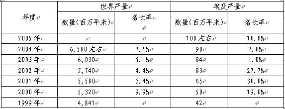 盡管埃及該行業(yè)產(chǎn)品的產(chǎn)量在2002年—2003年之間變化不大,但在1999年—2005年間的增長(zhǎng)速度卻超出了世界的平均增長(zhǎng)水平。