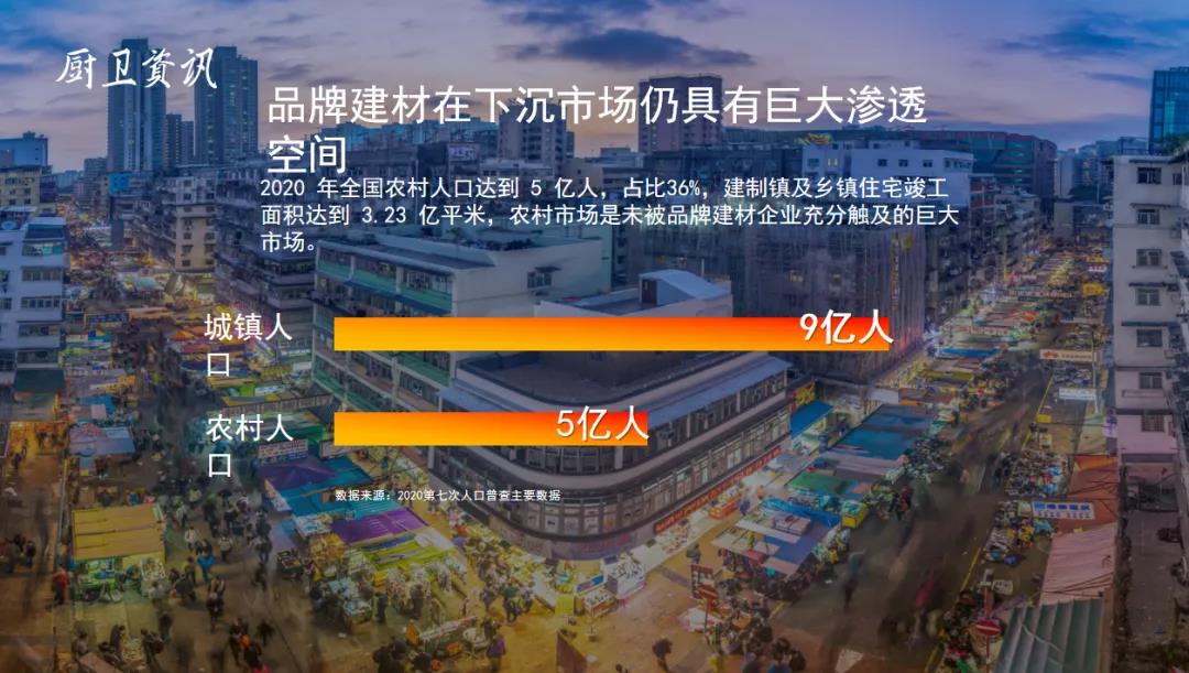 此外,2020 年全國農(nóng)村人口達(dá)到 5.4 億人,占比36%,建制鎮(zhèn)及鄉(xiāng)鎮(zhèn)住宅竣工面積達(dá)到 3.23 億平米,農(nóng)村市場(chǎng)是未被品牌建材企業(yè)充分觸及的巨大市場(chǎng)。