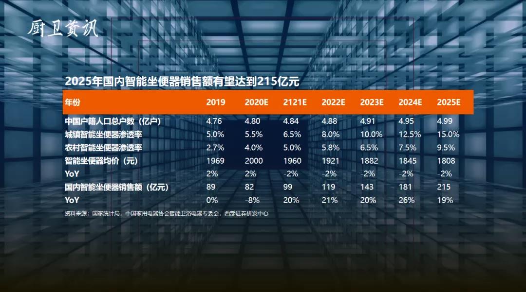 以智能馬桶為例,這組數(shù)據(jù)顯示,到2025年,我們中國智能馬桶銷售額有望達(dá)到215億元。這張表格可以看到,智能馬桶的城鎮(zhèn)、鄉(xiāng)村覆蓋率逐年穩(wěn)步提升,價(jià)格是逐年下降的。