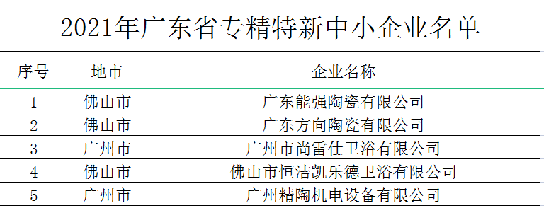 1月5日,廣東省工業(yè)和信息化廳公布2021年廣東省專精特新中小企業(yè)名單,1459家企業(yè)獲認(rèn)定。其中,廣東能強(qiáng)陶瓷有限公司、廣東方向陶瓷有限公司、廣州市尚雷仕衛(wèi)浴有限公司、佛山市恒潔凱樂德衛(wèi)浴有限公司、廣州精陶機(jī)電設(shè)備有限公司等5家陶瓷衛(wèi)浴及相關(guān)企業(yè)上榜。