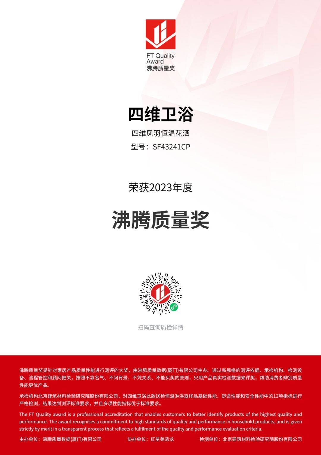 在2023沸騰質量獎測評中,四維衛(wèi)浴參評的四維鳳羽恒溫花灑SF43241CP,經過承檢機構北京建筑材料檢驗研究院股份有限公司,對四維衛(wèi)浴此款送檢恒溫淋浴器樣品基礎性能、舒適性能和安全性能中的13項指標進行嚴格檢測,結果達到測評標準要求,并且多項性能指標優(yōu)于標準要求,獲得“沸騰質量獎”。
