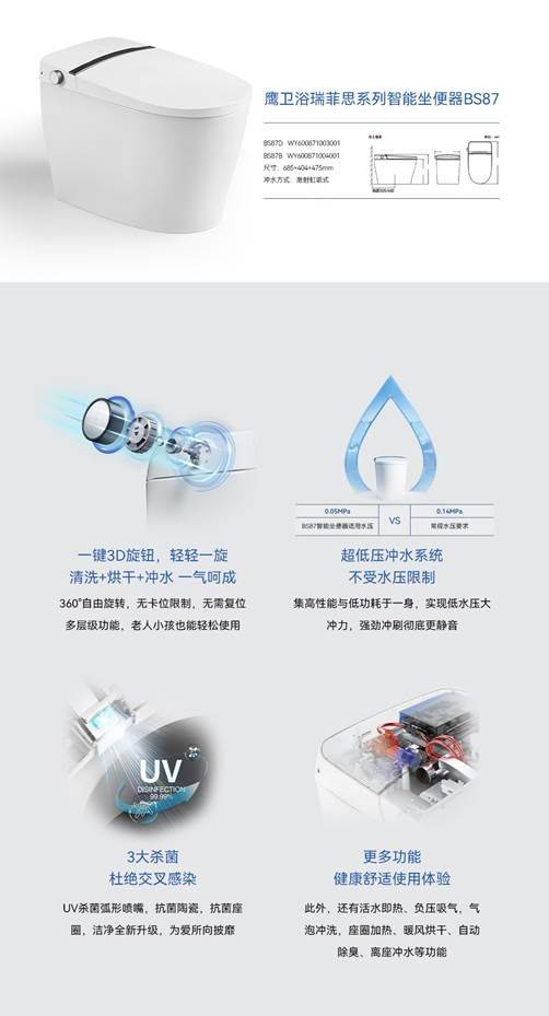 為了帶來美好的舒適體驗,設(shè)計師廖奕權(quán)特別挑選了鷹衛(wèi)浴瑞菲思系列智能坐便器BS87,優(yōu)雅機身、功能強大、使用便捷、潔凈升級。