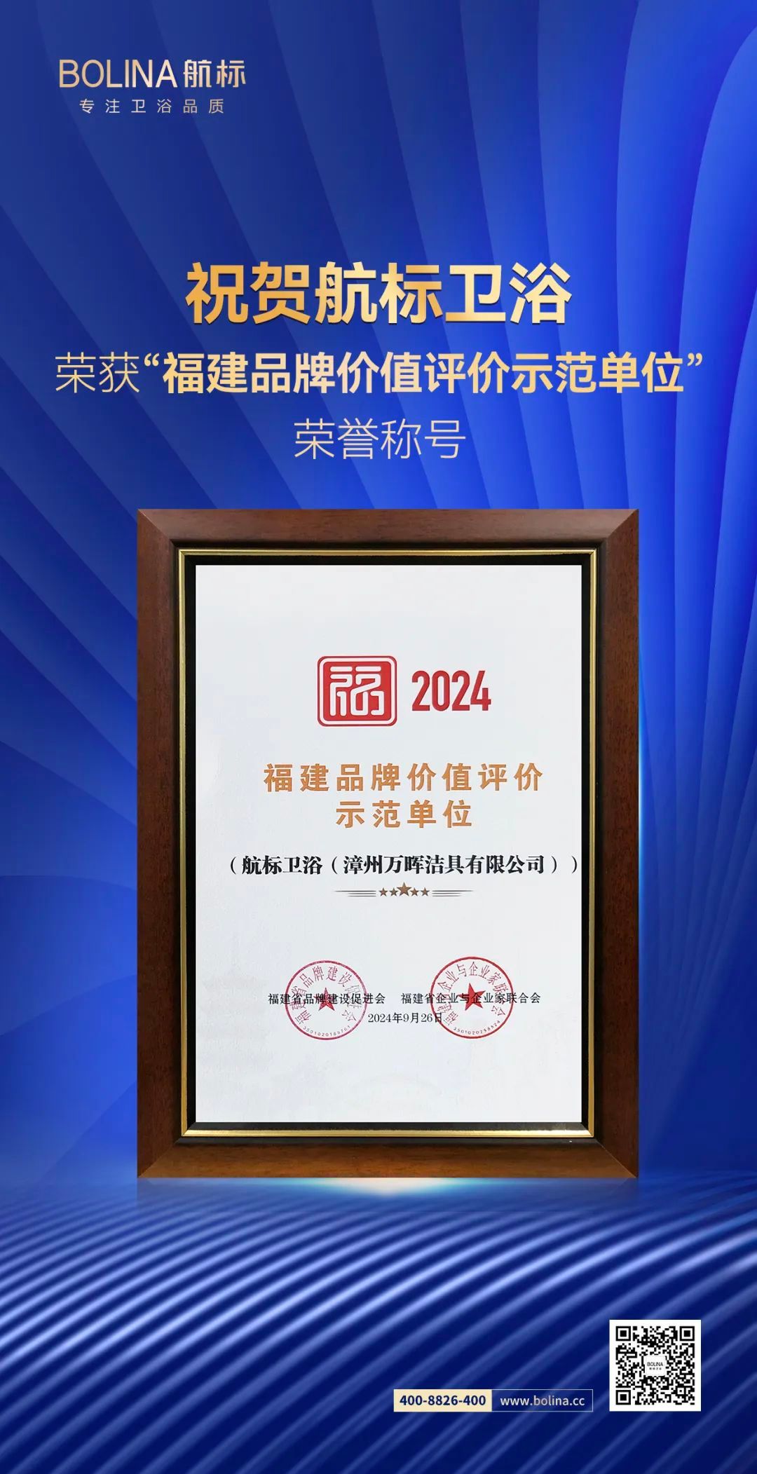 會(huì)上分別發(fā)布了區(qū)域類品牌價(jià)值評價(jià)信息和企業(yè)類品牌價(jià)值評價(jià)結(jié)果。航標(biāo)衛(wèi)浴榮登“2024中國品牌價(jià)值評價(jià)榜單”并榮獲“福建品牌價(jià)值評價(jià)示范單位”榮譽(yù)稱號 。