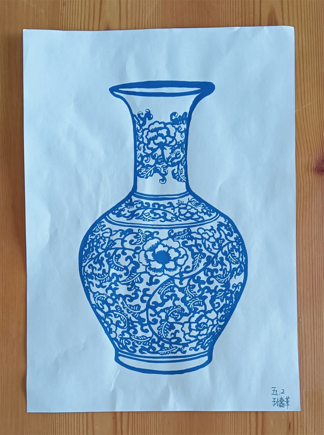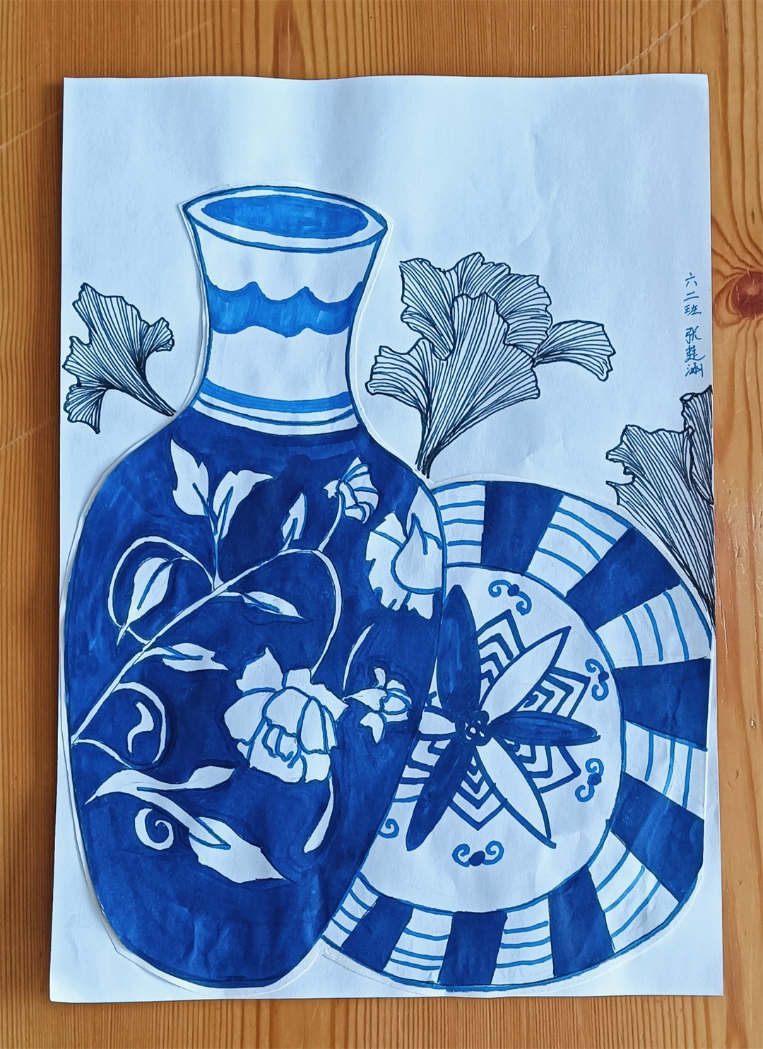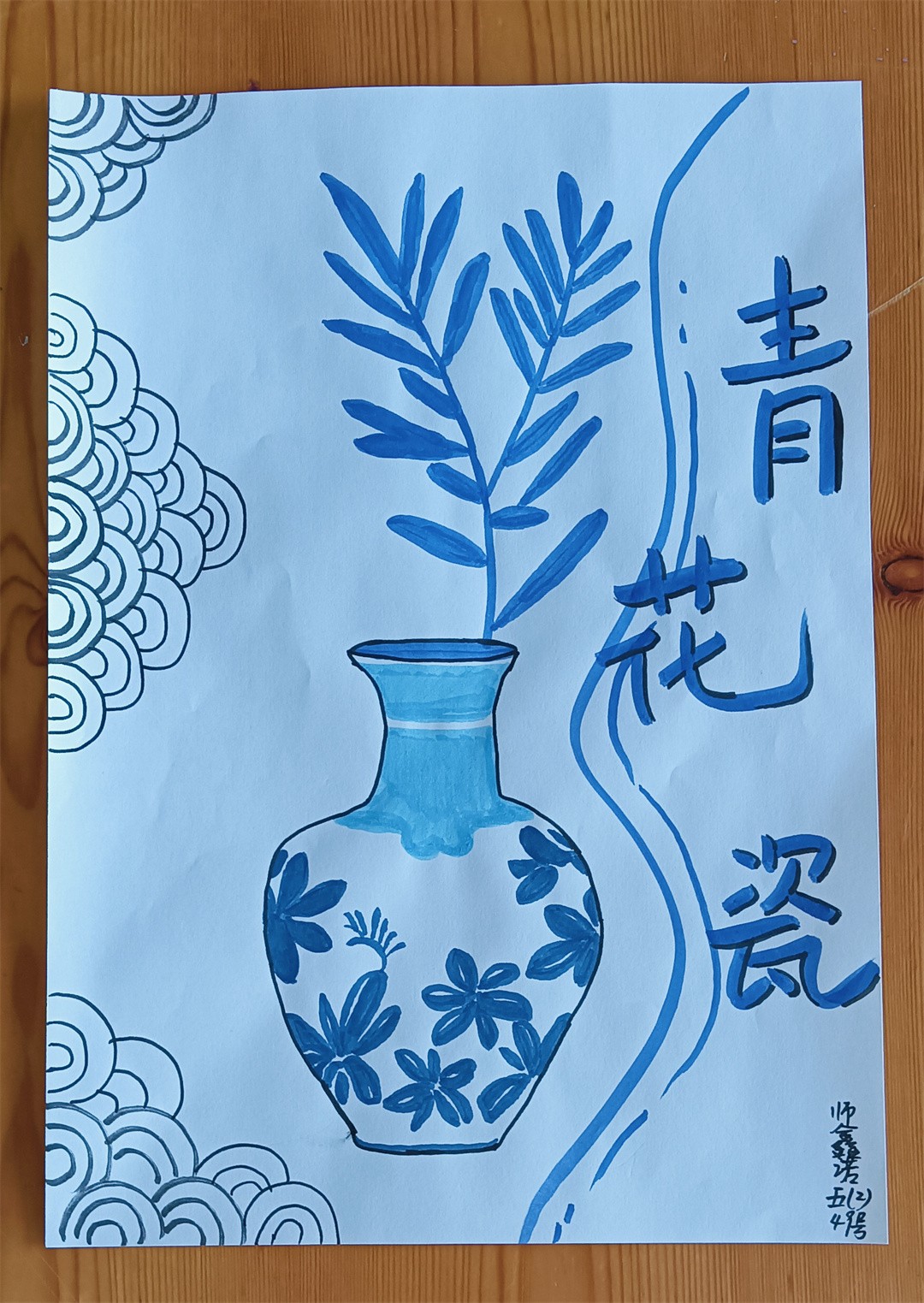 青花瓷線描,1、輪廓起稿,觀察青花瓷圖片資料,用鉛筆分出瓶口、瓶身、瓶底區(qū)域,注意線條方向,不是直線條。2、用鉛筆勾勒出花紋,注意用鉛筆時(shí),筆要輕。3、用藍(lán)色馬克筆勾勒出花紋,完成后要把鉛筆印擦掉。4、用藍(lán)色馬克筆加花紋、畫色塊,刻畫細(xì)節(jié)部分,使畫面更豐富。最后寫上班級(jí)、姓名。隨后,在陶藝?yán)蠋煹闹笇?dǎo)下,同學(xué)們拿起畫筆,巧妙構(gòu)圖,每一筆細(xì)致的勾勒,每一劃深情的描繪,同學(xué)們的設(shè)計(jì)作品,構(gòu)圖完整,造型可愛,線條流暢自如,展現(xiàn)了同學(xué)們獨(dú)特的藝術(shù)視角和豐富的想象力,每一幅作品,都是同學(xué)們對傳統(tǒng)文化的一個(gè)深刻詮釋與獨(dú)特表達(dá)。陶藝課不僅提高了同學(xué)們的動(dòng)手與藝術(shù)設(shè)計(jì)能力、審美能力和創(chuàng)造力,還增進(jìn)了同學(xué)們對青花瓷文化的理解與欣賞,從中了解青花瓷的特點(diǎn),領(lǐng)略青花瓷的清秀典雅,感受著青花瓷器的精美絕倫。助力同學(xué)們在藝術(shù)的滋養(yǎng)中茁壯成長。
